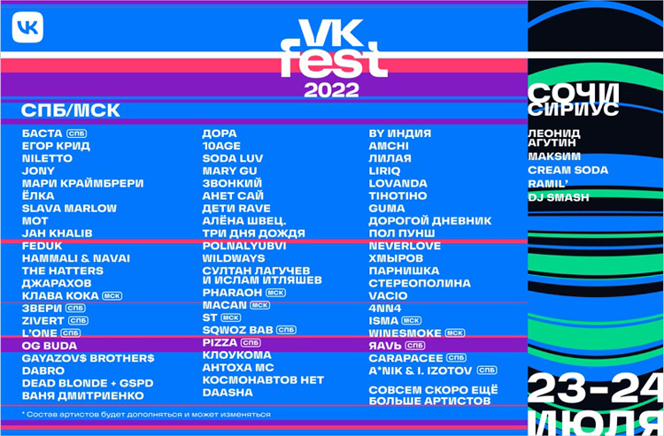 «Aqui, ao longo de dois dias de festival, novos itens e faixas populares serão apresentados por Egor Creed, NILETTO, JONY, Mari Kraymbreri, Yolka, SLAVA MARLOW, ILO, Jah Khalib, FEDUK, HammAli & Navai, The Hatters, Dzharakhov, OG Buda, GAYAZOV$ BROTHER$, Dabro DEAD BLONDE + GSPD outros”, disse o comunicado.