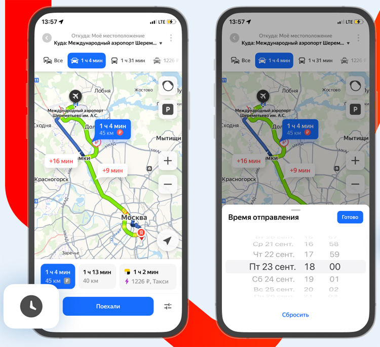O Maps criará uma rota com base em dados históricos de tráfego e mostrará quanto tempo uma viagem geralmente leva. Para usar a função, você precisa construir uma rota, clicar no relógio à esquerda do botão “Vamos lá” e selecionar a data e hora. O aplicativo mostrará o tempo aproximado de viagem, mas se você clicar em “Vamos”, avisará que a rota será reconstruída levando em consideração a situação atual do trânsito.