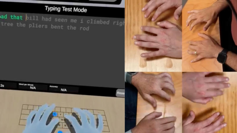 No vídeo, Zuckerberg e o CTO da Meta✴, Andrew Bosworth, colocam o Quest 2, e a imagem do dispositivo, uma projeção de contorno virtual de um teclado QWERTY, é exibida na tela ao lado deles. Os principais gerentes batem os dedos na mesa e o fone de ouvido rastreia seus movimentos, e cópias virtuais das mãos em azul inserem o texto. O chefe da empresa conseguiu acelerar a velocidade de 100 palavras por minuto, e o diretor técnico ficou com todas as 119. O digitador médio, em comparação, produz apenas 40 palavras por minuto.