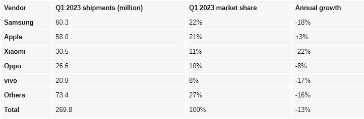 A Samsung vendeu 60,3 milhões de smartphones no primeiro trimestre, uma queda de 18% em relação ao ano anterior. Com isso, a empresa coreana ficou com 22% do mercado. As principais vendas da empresa foram feitas por novos aparelhos das séries Galaxy S e Galaxy A. A Apple vendeu 58 milhões de smartphones nos primeiros três meses deste ano e ocupou 21% de participação no mercado. A Apple continua vendo uma forte demanda por smartphones iPhone 14 Pro. A empresa sediada em Cupertino foi a única entre os principais fornecedores de smartphones a fechar o trimestre em território positivo, aumentando as remessas em 3%.