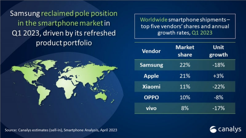 A Samsung vendeu 60,3 milhões de smartphones no primeiro trimestre, uma queda de 18% em relação ao ano anterior. Com isso, a empresa coreana ficou com 22% do mercado. As principais vendas da empresa foram feitas por novos aparelhos das séries Galaxy S e Galaxy A. A Apple vendeu 58 milhões de smartphones nos primeiros três meses deste ano e ocupou 21% de participação no mercado. A Apple continua vendo uma forte demanda por smartphones iPhone 14 Pro. A empresa sediada em Cupertino foi a única entre os principais fornecedores de smartphones a fechar o trimestre em território positivo, aumentando as remessas em 3%.