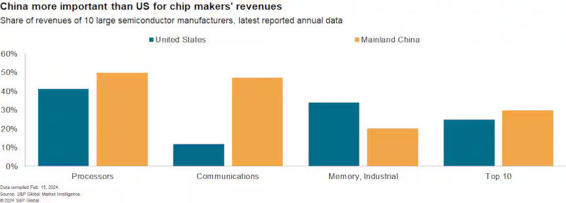 Os principais fabricantes de chips dos EUA, incluindo Intel, Broadcom, Qualcomm e Marvell Technology, obtêm mais receitas da China do que dos EUA, de acordo com dados da S&P Global. A partir de Outubro de 2022, os Estados Unidos introduziram uma série de controlos de exportação rigorosos destinados a limitar o acesso da China a tecnologias avançadas no domínio dos componentes semicondutores, principalmente às utilizadas em sistemas de inteligência artificial.