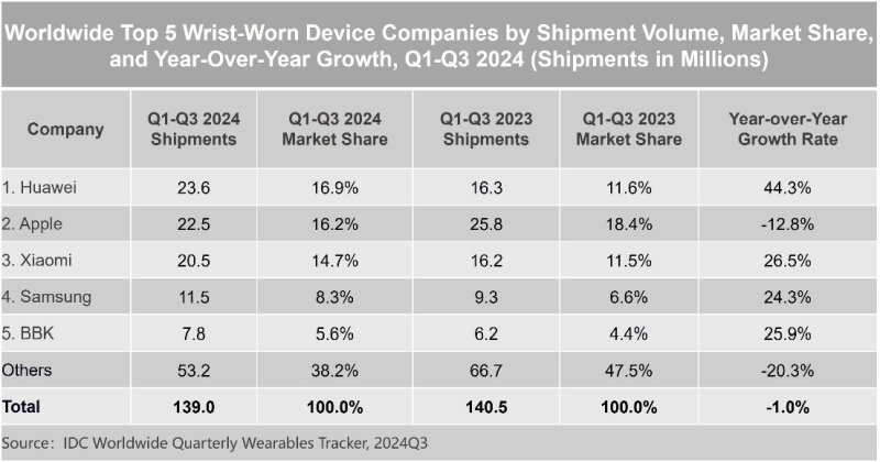 O quarto lugar é ocupado pela Samsung, que somou 24,3% no volume de fornecimento, mas entregou apenas 11,5 milhões de aparelhos, e sua participação aumentou de 6,6 para 8,3%. A chinesa BBK fecha os cinco primeiros com uma participação de mercado de 5,6% e um aumento nos embarques de 25,9%, para 7,8 milhões de unidades. Todos os outros fabricantes de dispositivos de pulso nos três trimestres deste ano reduziram as remessas de produtos em 20,3%, para 53,2 milhões de unidades, sua participação caiu de 47,5 para 38,2% em relação ao mesmo período do ano passado.
