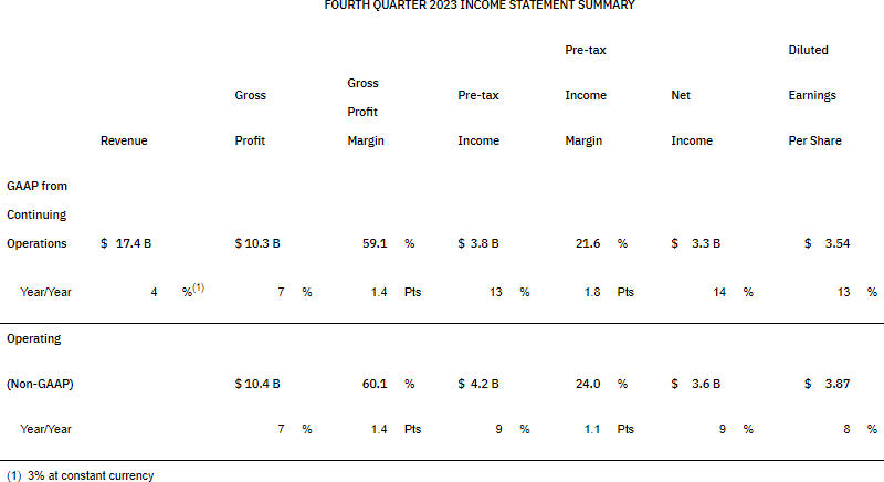 A receita do segmento de IA generativa quase dobrou no quarto trimestre – um terço desse valor veio de software e o restante veio de serviços de consultoria. O setor de infraestrutura, que inclui o negócio de mainframe, registrou receita de US$ 4,6 bilhões, contra expectativas de US$ 4,29 bilhões. A empresa continua operando em um ambiente “muito volátil e incerto”, segundo o CFO James Kavanaugh. O maior segmento, software, apresentou crescimento de aproximadamente 3%. Até o final de 2024, a IBM planeja aumentar a receita em 4-6%, embora os analistas de Wall Street prevejam cerca de 3%.