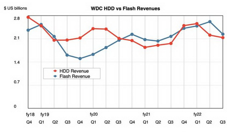 No geral, a receita de discos rígidos da Western Digital foi de US$ 2,14 bilhões, um aumento de 9% ano a ano, e as vendas de SSDs foram de US$ 2,24 bilhões, um aumento de 3%. No entanto, de forma geral, a dinâmica de vendas no último trimestre caiu, o que pode ser observado no gráfico abaixo.