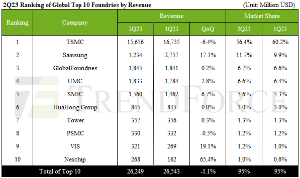 A líder mundial continua a ser a empresa taiwanesa TSMC, mas reduziu as receitas no segundo trimestre em 6,4%, para 15,7 mil milhões de dólares, e a sua quota de mercado encolheu de 60,2 para 56,4%. O que é digno de nota é que entre os cinco primeiros, apenas a TSMC registou tanto um declínio nas receitas como um declínio na sua quota de mercado. Isto pode ser explicado pela elevada dependência da empresa em processos tecnológicos avançados, cuja procura no segmento de smartphones continua baixa. Na verdade, embora os produtos de 6nm e 7nm da TSMC ainda tivessem uma demanda adequada no último trimestre, os chips mais avançados de 5nm e 4nm venderam pior. Espera-se que o lançamento do Apple iPhone no terceiro trimestre aumente a receita da TSMC, à medida que ela começa a comercializar os mais recentes chips de 3 nm com maior valor agregado.