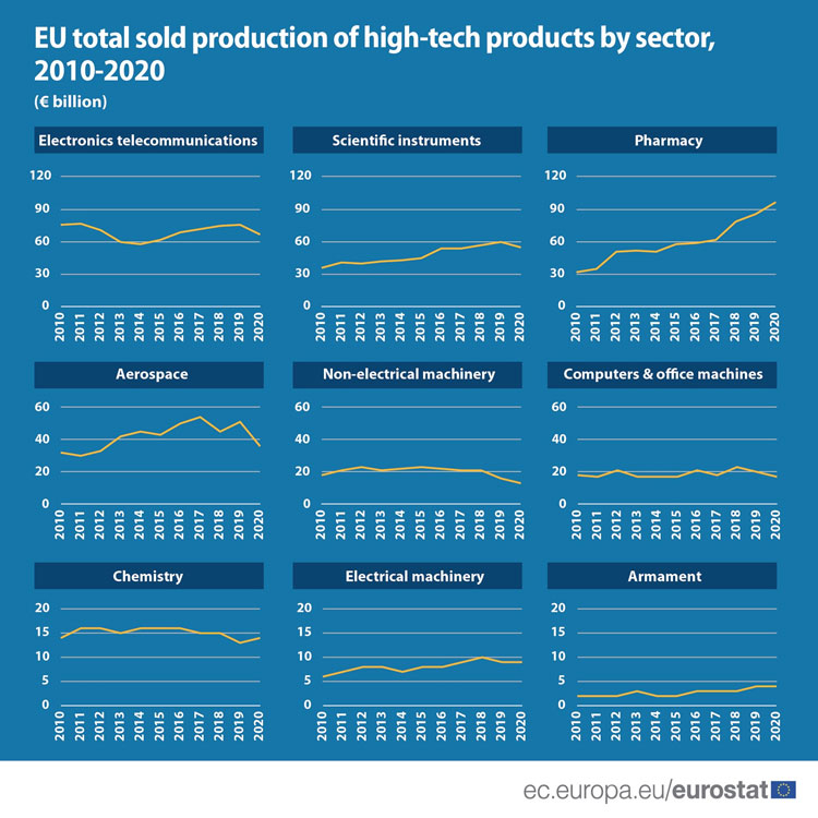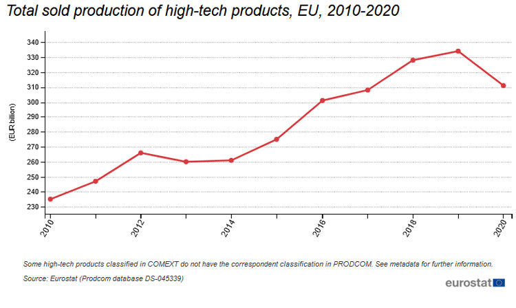 O Eurostat informou sobre as receitas em 2020 da União Europeia na produção e venda de produtos de alta tecnologia. Em comparação com 2019, a receita diminuiu 7%, o que pode ser atribuído à pandemia de coronavírus COVID-19, mas, em geral, o setor de alta tecnologia gerou EU € 311 bilhões por ano. Além disso, antes da pandemia, o setor estava crescendo de forma constante desde 2010 a uma média de 2,9% ao ano.