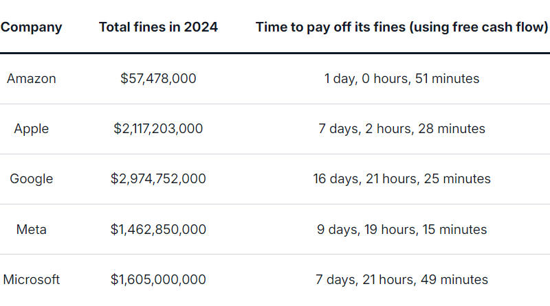 O Google foi o maior multado em 2024 – o valor total foi de pouco menos de US$ 3 bilhões. Se levarmos em conta o fluxo de caixa livre da empresa, ou seja, receita menos despesas com equipamentos, imóveis e outros itens necessários ao seu trabalho, a empresa tem condições. pagar todas as suas multas em aproximadamente três semanas de trabalho. A Meta✴ precisa de menos de duas semanas para cobrir seus US$ 1,46 bilhão em multas. A Amazon foi multada em apenas US$ 57 milhões – um valor dentro do erro estatístico que é compensado pela renda de apenas um dia. Por outras palavras, é pouco provável que as multas impostas aos gigantes da tecnologia sejam um impedimento significativo para eles.