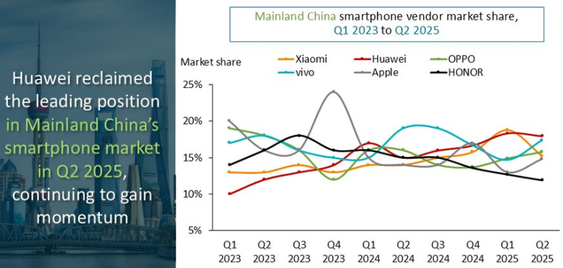 Em meio a uma queda generalizada nas vendas de smartphones no segundo trimestre, a Huawei retomou a liderança, vendendo 12,2 milhões de unidades e conquistando 18% do mercado. A Vivo ficou em segundo lugar com 11,8 milhões de unidades e 17% do mercado, enquanto a Oppo ficou em terceiro com 10,7 milhões de unidades e uma participação de mercado de 16%. A Xiaomi, que registrou seu oitavo trimestre consecutivo de crescimento, ficou em quarto lugar com 10,4 milhões de unidades. A Apple ficou em quinto lugar com 10,1 milhões de unidades.