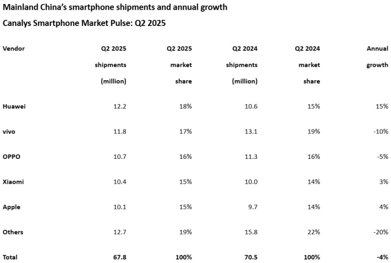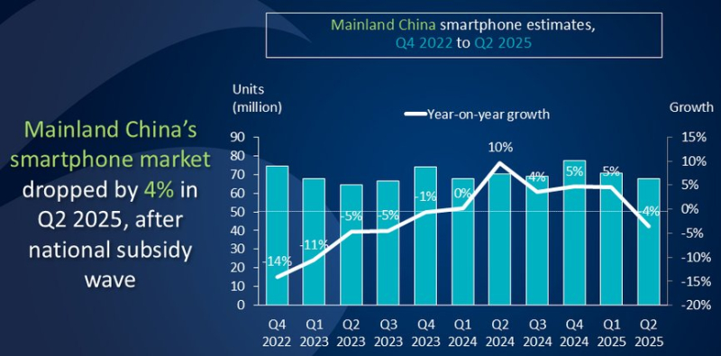De acordo com a pesquisa mais recente da Canalys, o mercado de smartphones da China contraiu 4% em relação ao ano anterior no segundo trimestre de 2025, à medida que os incentivos dos programas nacionais de subsídios começaram a diminuir. Apesar da desaceleração, a demanda subjacente do consumidor permaneceu robusta, com as remessas totais de smartphones apresentando um ligeiro aumento em relação ao ano anterior no primeiro semestre do ano.