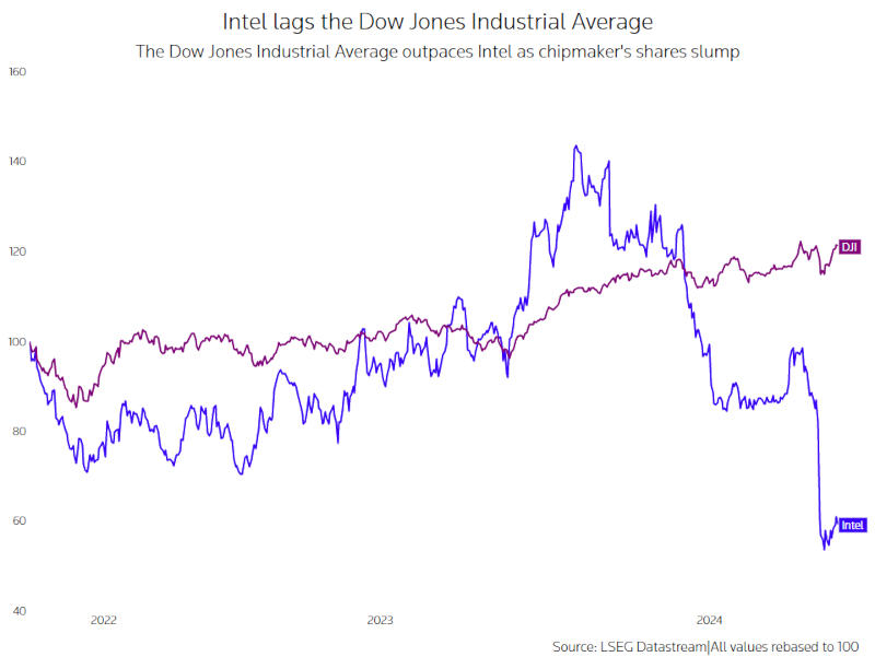 Analistas acreditam que a Intel provavelmente será retirada do índice Dow Jones: suas ações perderam 60% desde o início do ano, o pior desempenho entre os membros do índice, e a empresa tem o menor preço das ações. A exclusão do índice piorará ainda mais a já manchada reputação da Intel. A empresa perdeu o boom da inteligência artificial ao recusar-se a investir na OpenAI e está lutando para superar as perdas em sua unidade de fabricação contratada de semicondutores, que esperava competir com a TSMC.