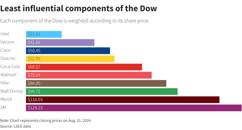 O principal critério para inclusão no Dow Jones é o preço das ações, ao contrário do S&P 500, que leva em consideração o valor de mercado das empresas. O comitê de seleção de ações monitora se o título mais caro é mais de 10 vezes maior que o mais barato. Atualmente, as ações do UnitedHealth Group têm o maior peso no índice, cerca de 29 vezes o preço das ações da Intel. A fabricante de chips também é o membro menos influente do índice, com um peso de 0,32% – suas ações fecharam a US$ 20,13 em 29 de agosto. A excepção afectará tanto a reputação como o preço das acções da empresa – já perderam mais de 70% desde o máximo histórico alcançado em Agosto de 2000. Pela primeira vez em mais de 30 anos, o valor de mercado da Intel caiu abaixo de US$ 100 bilhões.