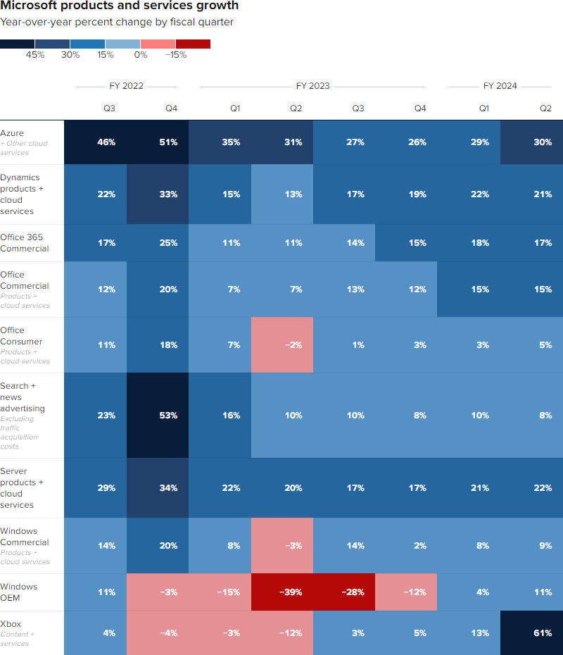 A receita trimestral da Microsoft cresceu 17,6% em comparação com o mesmo período do ano anterior. O lucro líquido foi de US$ 21,87 bilhões – um ano antes foi de US$ 16,43 bilhões ou US$ 2,20 por ação. A receita do segmento de Serviços de Nuvem Inteligente foi de US$ 25,88 bilhões, um aumento de 20% e superando as expectativas dos analistas de US$ 25,29 bilhões. Este grupo inclui Azure, SQL Server, Windows Server, Nuance, GitHub e serviços empresariais. A receita do Azure e de outros serviços em nuvem cresceu 30% – os analistas esperavam 27,5% (StreetAccount). A divisão Azure AI da Microsoft tem agora 53.000 clientes, e um terço deles ingressou na empresa no ano passado, disse o CEO Satya Nadella.