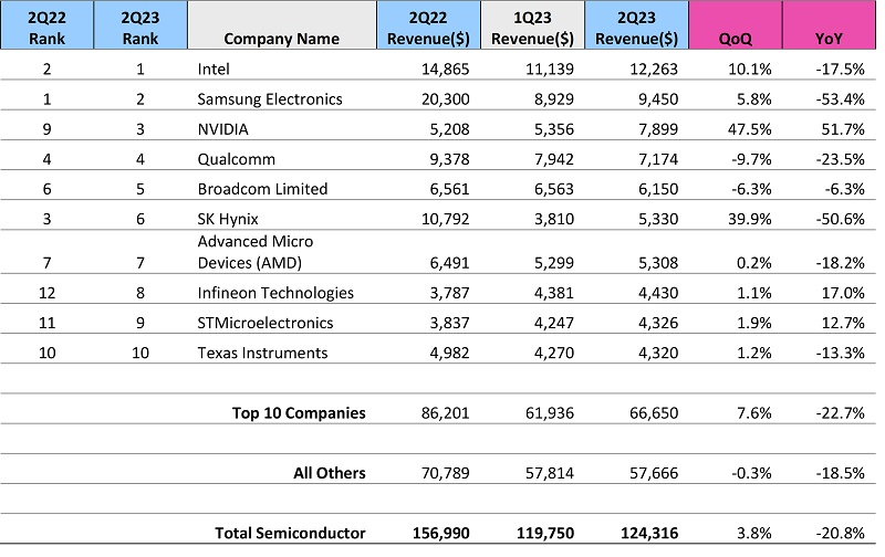 De acordo com a Omdia, o crescimento das receitas ocorre após o mais longo período de declínio desde que os registos começaram em 2002. Ao mesmo tempo, a capacidade do mercado de semicondutores diminuiu significativamente, para um nível de 79% dos valores no segundo trimestre de 2022. A NVIDIA acabou sendo a líder em crescimento; ao longo do ano, passou do nono para o terceiro lugar no ranking dos maiores fornecedores de chips em receita. Do crescimento total da receita trimestral de US$ 4,6 bilhões, a NVIDIA foi responsável por US$ 2,5 bilhões. Lembre-se de que a NVIDIA aumentou sequencialmente sua própria receita em 47,5% no segundo trimestre e cresceu 51,7% ano a ano.