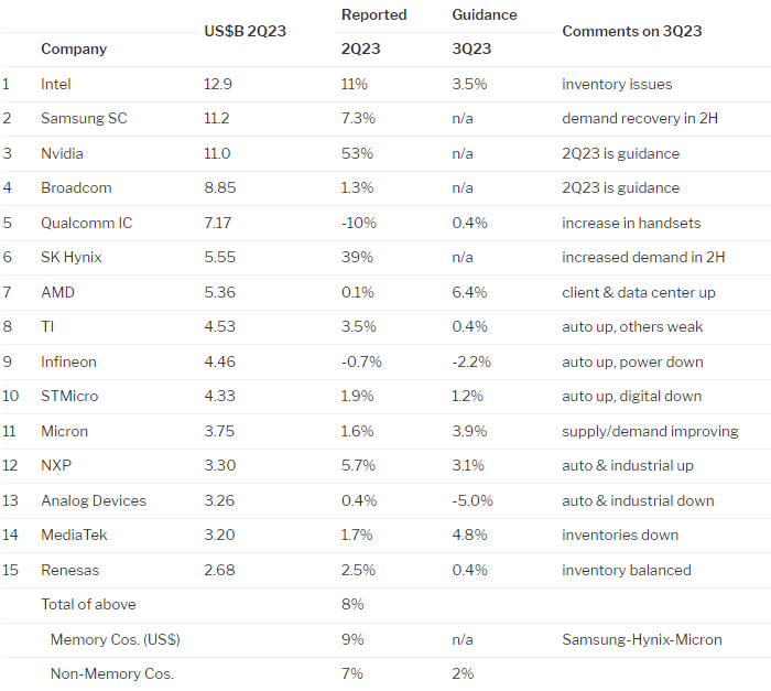 A NVIDIA divulgará oficialmente seus resultados do segundo trimestre na próxima semana, mas com base na própria previsão da administração, sua receita para o período deve aumentar 53%, para US$ 11 bilhões, tornando-se o terceiro maior fornecedor de chips em termos de receita. Em geral, os relatórios das 15 maiores empresas do setor mostraram que, no segundo trimestre, a receita de queda se transformou em crescimento.