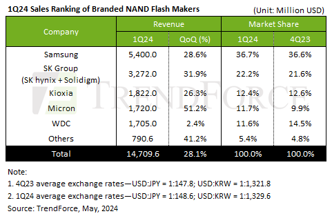 A Samsung continua líder de mercado com uma participação de 37%, a receita da empresa proveniente das vendas de NAND cresceu 28,6%, para US$ 5,4 bilhões. O Grupo SK (SK Hynix + Solidigm) ficou em segundo lugar com uma participação de 22% e um crescimento de receita de 31,9%. para US$ 3,27 bilhões. O terceiro e quarto lugares são ocupados pela Kioxia e Micron com participações de 12% e 13%, respectivamente.