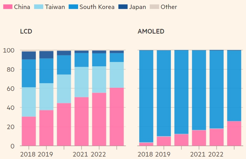 A Samsung e a LG assumiram o controle do mercado global de monitores na década de 2000, após investimentos agressivos que as ajudaram a derrubar os líderes japoneses. Eles próprios produziam os ecrãs para as suas TVs e smartphones, mas o idílio foi perturbado pelo surgimento de concorrentes chineses, apoiados por subsídios governamentais e por um gigantesco mercado interno. Tendo conquistado o mercado de massa de telas LCD, os fabricantes chineses ameaçam minar a posição das empresas sul-coreanas no campo das telas OLED premium.