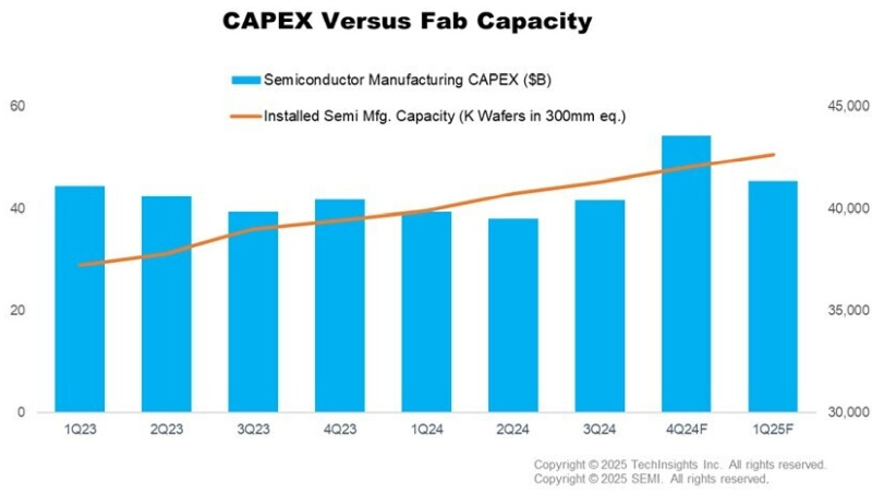 No quarto trimestre de 2024, a capacidade instalada de fabricação de wafers ultrapassou o recorde de 42 milhões de wafers por trimestre em todo o mundo (equivalente a wafer de 300 mm) e deve crescer para 42,7 milhões no primeiro trimestre de 2025. A capacidade lógica e de fabricação contratada continua a crescer, com alta de 2,3% sequencial no quarto trimestre e previsão de crescimento de 2,1% no trimestre atual de 2025, impulsionada pela expansão da capacidade em tecnologias de processo avançadas.