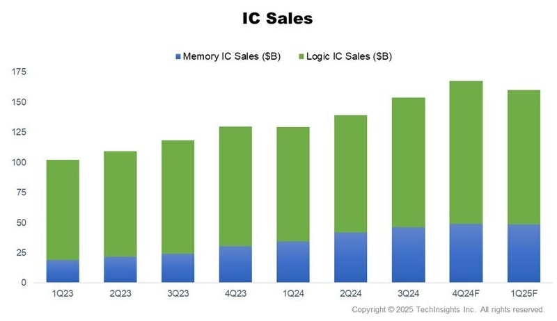 Após queda no primeiro semestre de 2024, as vendas de eletrônicos se recuperaram e apresentaram crescimento anual de 2%. As vendas de eletrônicos cresceram 4% ano a ano no quarto trimestre de 2024 e devem aumentar 1% no primeiro trimestre de 2025. As vendas de circuitos integrados no quarto trimestre cresceram 29% em relação ao ano anterior. Espera-se um crescimento de 23% no primeiro trimestre de 2025, impulsionado pelo atual boom da IA.