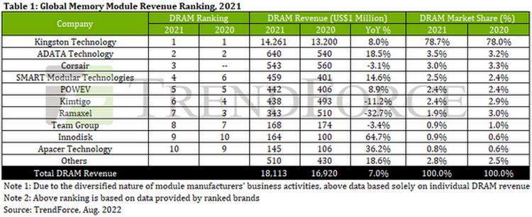 Analistas da TrendForce estimam que a receita do mercado de RAM em 2021 subiu para US$ 18,1 bilhões, um aumento de 7% em relação ao ano anterior. Segundo especialistas, 90% do fornecimento global de módulos de RAM em 2021 veio de cinco fabricantes. 10 empresas foram responsáveis ​​por 97% das remessas de memória do mundo. Ao mesmo tempo, quase 80% das entregas vieram de Kingston. Sua receita anual neste segmento cresceu 8%.