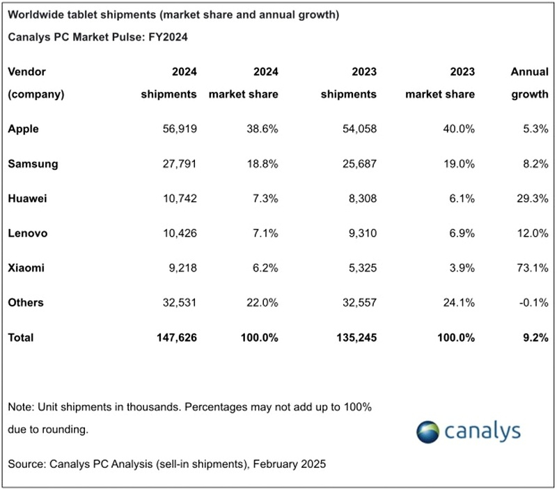 A Apple, em 2024, entregou 56,9 milhões de tablets, capturando 38,6 % desse mercado. O segundo lugar foi conquistado pela Samsung com 27,8 milhões de dispositivos vendidos, o que corresponde a uma participação de mercado de 18,8 %. O terceiro lugar foi para a Huawei – enviou 10,74 milhões de comprimidos, garantindo 7,3 % dos suprimentos mundiais.