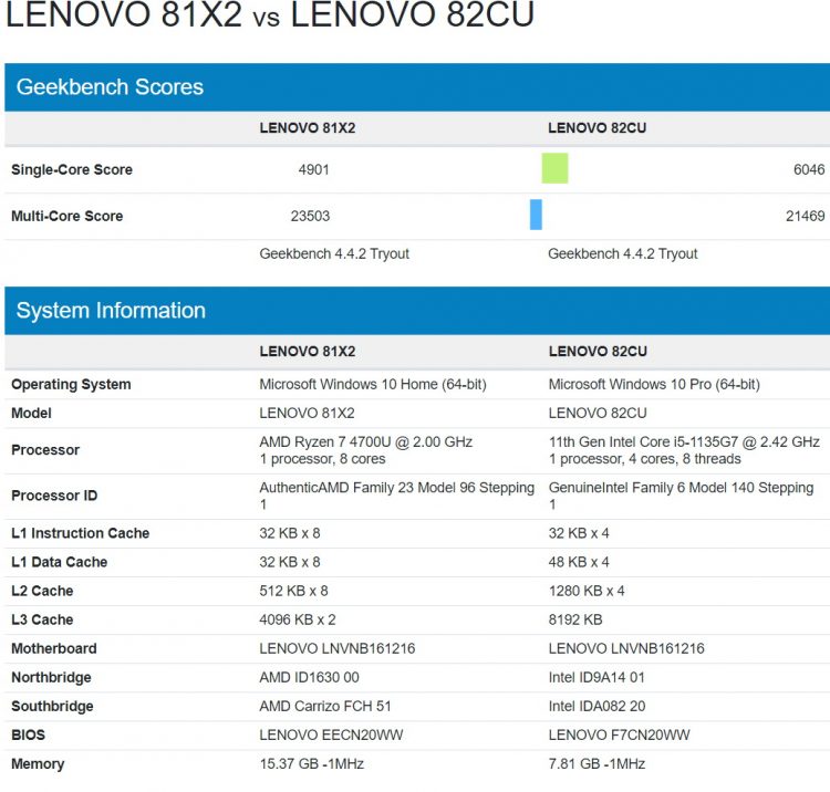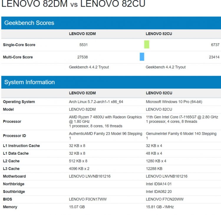O teste de desempenho do processador Intel foi realizado como parte de um laptop Lenovo não anunciado (modelo 82CU). Em um teste Geekbench 4 de thread único, o chip Core i7-1165G7 conseguiu marcar até 6737 pontos, em um teste multiencadeado – até 23 414 pontos. Dentro de um laptop Lenovo semelhante (82DM), o processador Ryzen 7 4800U, que possui o dobro de núcleos e threads virtuais, mostrou um resultado de até 5584 pontos em um teste de thread único. No teste multithread, o chip AMD marcou 27.538 pontos.