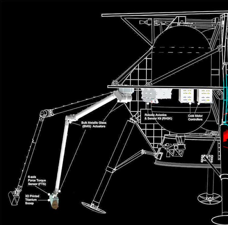 Nos mecanismos de COLDArm e nunca use graxa, porque os artigos são fabricados de silício amorfo de ligas metálicas (vidro metálico). Esses materiais são obtidos quando a temperatura e, posteriormente, um rápido resfriamento, devido a que eles não têm tempo para se recuperar de cristal grade. O resultado amorfo metais não perdem a resistência a baixas temperaturas e são ideais para a produção de pinhão para COLDArm. Produzido pela empresa de Motiv, parceiro da NASA, o controlador do motor também é capaz de limpa a funcionar em temperaturas de até -173 °C — ele é capaz de trabalhar não só o luar pólo, mas também em Marte e na lua de Saturno, Titã.