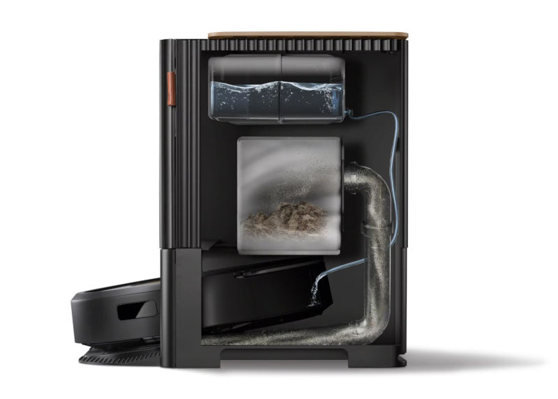A docking station revelou-se muito atrativa, e seu grande tamanho se deve ao coletor de pó e à caixa d’água localizados em seu interior: o primeiro pode ser esvaziado uma vez a cada 60 dias, o segundo pode ser reabastecido uma vez a cada 30 dias. Neste caso, o robô terá que escolher de forma independente de que lado entra na estação de acoplamento, já que a porta para adição de água fica de um lado e a porta para coleta de pó fica do outro. Mas os próprios usuários ainda precisam limpar o pano de limpeza, embora outros fabricantes de aspiradores robóticos já ofereçam sistemas de limpeza automáticos.