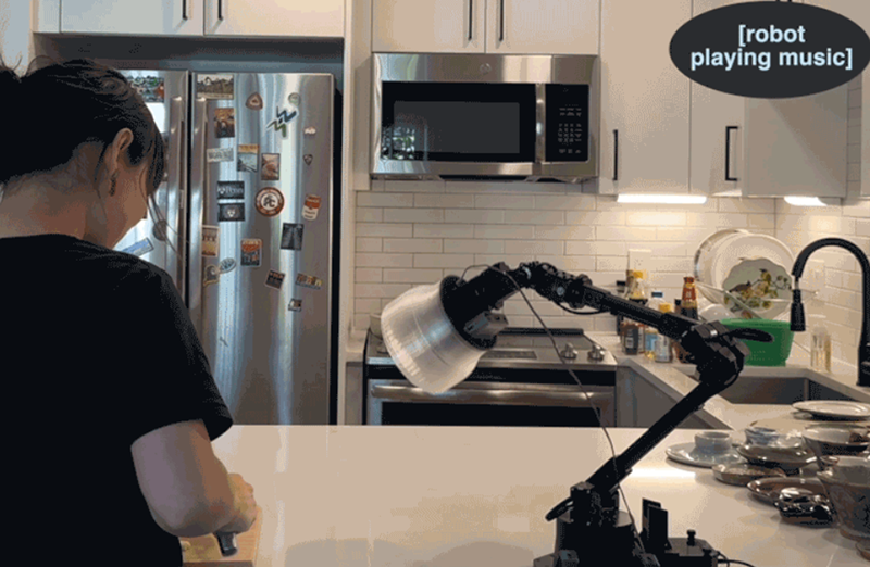 O robô expressivo interage com uma pessoa de maneira realista. Por exemplo, quando o usuário pede o clima, o robô olha pela primeira vez pela janela antes de relatar a previsão. Para lembrá -lo da necessidade de beber água, ele empurra a caneca. Se uma pessoa disser que está fazendo uma caminhada, mas não será capaz de levar o robô com ele, ele abaixa a “cabeça” em tristeza. Quando uma pessoa coleta uma impressora 3D, o robô projeta o vídeo de treinamento correspondente na parede. Ele também reage aos gestos de suas mãos, movendo -se para garantir a iluminação desejada durante a fotografia no iPhone. Além disso, o vídeo mostra como o robô inclui música e danças, levantando o clima do interlocutor.