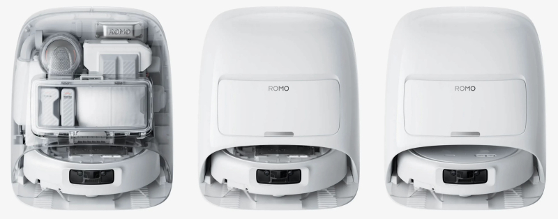 Todas as três versões do DJI Romo vêm com uma estação de acoplamento que esvazia, limpa, reabastece e carrega o robô aspirador automaticamente. Todo o processo leva cerca de duas horas e meia. O Romo S tem um corpo completamente opaco, o Romo A tem um painel superior transparente e o Romo P é completamente transparente, incluindo a estação de acoplamento.