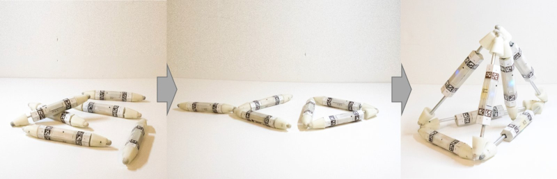 Os pesquisadores registraram como as barras de reforço se uniram inicialmente em formas bidimensionais e, em seguida, integraram novas peças para formar um tetraedro tridimensional capaz de se mover em um local de teste irregular. O robô conseguiu isso usando o elo extra como suporte.