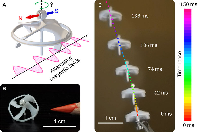 A influência de um campo eletromagnético externo faz com que os ímãs girem em uma determinada frequência e na direção desejada. A rotação cria sustentação, que pode ser controlada remotamente. O robô do tamanho de uma abelha é capaz de decolar, pairar no lugar e se mover em todas as direções sem estar fisicamente preso a objetos na bancada do laboratório.
