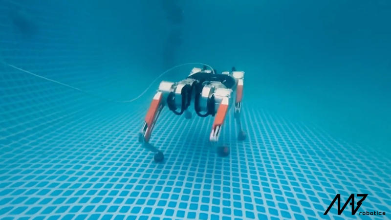 A empresa polonesa MAB Robotics demonstrou uma nova habilidade de seu robô canino Honey Badger (inglês – texugo de mel) – uma máquina de quatro patas corria ao longo do fundo da piscina.