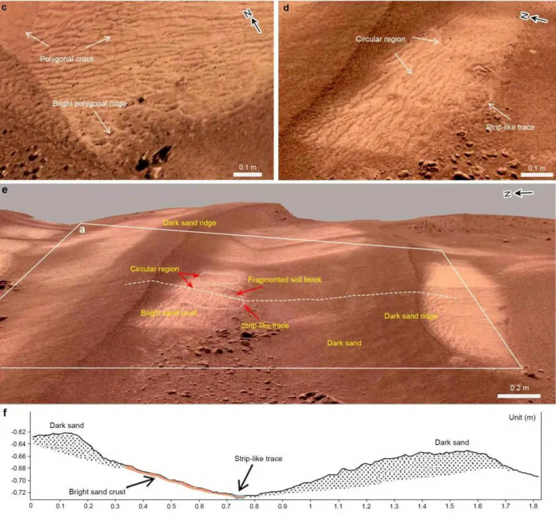 (C) Rachaduras e sulcos. (d) Marcas de listras. (e) Imagem 3D NaTeCam de uma depressão entre duas dunas. (f) Seção transversal de uma duna ao longo do perfil da linha pontilhada branca em (e)