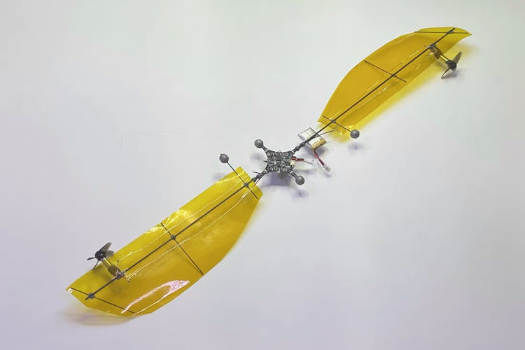 O design proposto por cientistas chineses para um drone leve pesando apenas 35 gramas parece um peixe-leão gêmeo com grandes asas feitas de filme de poliamida em trilhos de fibra de carbono. A decisão original foi colocar pequenos motores elétricos perto das extremidades das asas paralelas ao solo. Pequenos motores giram a estrutura de duas pás e, devido à sustentação, o drone pode pairar no ar e até realizar manobras controladas.