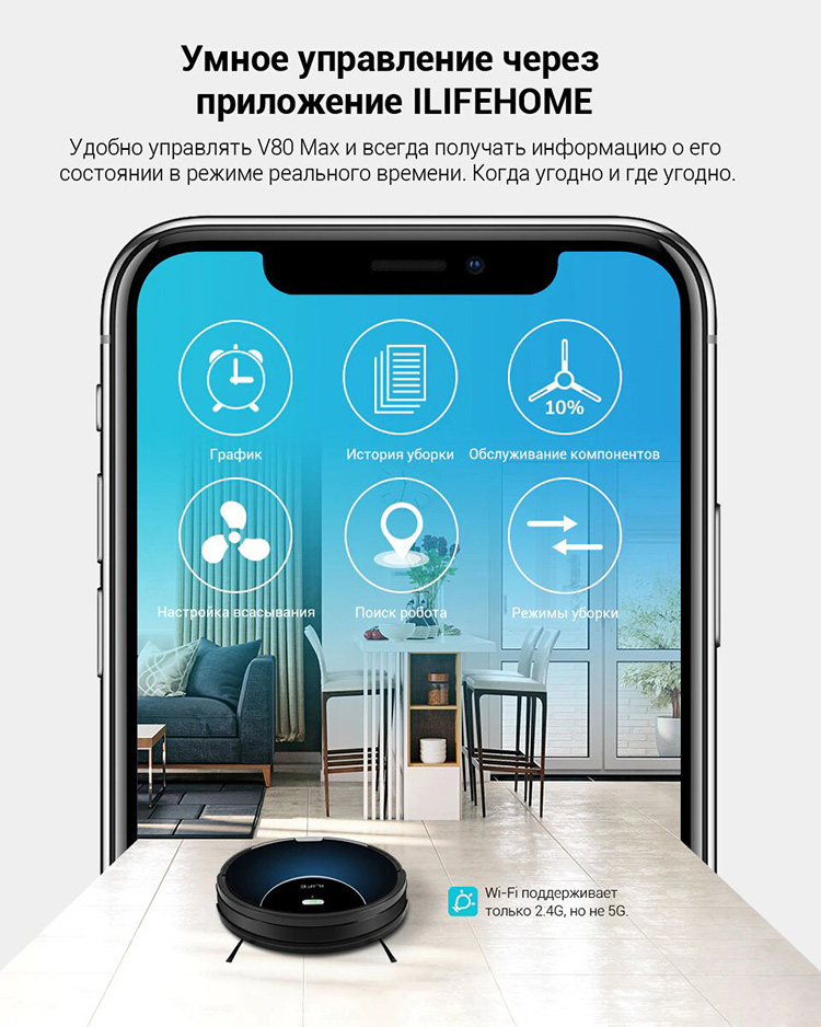 Você pode usar o botão físico no dispositivo para iniciar o iLife V80 MAX. Você também pode usar o controle remoto e o aplicativo móvel ILIFEHOME instalado no seu smartphone para controlá-lo (o aspirador iLife V80 MAX está equipado com um adaptador Wi-Fi). No aplicativo, você pode definir uma programação semanal, além de zonas de limpeza, e o aspirador robô fará a limpeza automática da sala de acordo com a necessidade do usuário.