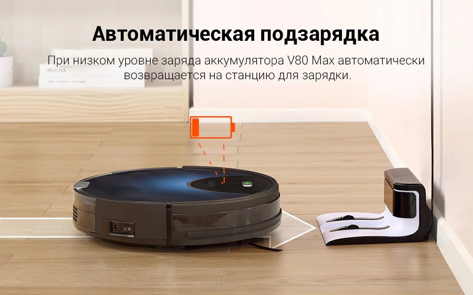 O reservatório de água tem capacidade para 300 ml. Graças ao gerenciamento inteligente da água, o aspirador robô remove com eficácia a sujeira e as manchas durante a limpeza úmida. A bateria recarregável com capacidade de 2600 mAh proporciona limpeza contínua por 80 minutos. Quando a bateria está fraca, o iLife V80 MAX é enviado automaticamente para a estação de carregamento. Demora menos de 360 minutos para carregar totalmente o aspirador de pó robô.