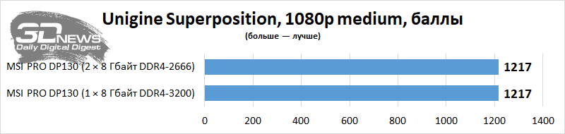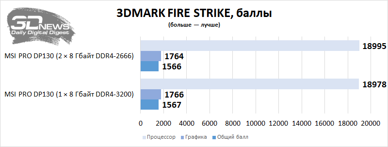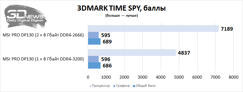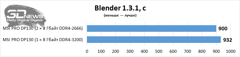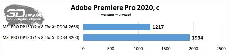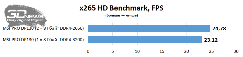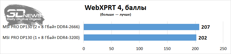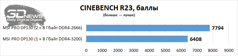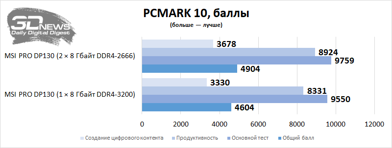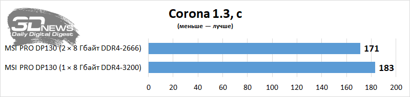 Vejamos o nível de desempenho da área de trabalho em aplicativos e jogos com uso intensivo de recursos. Vou comparar o PRO DP130 em termos de desempenho com ele, mas somente após uma pequena atualização deste PC – ou seja, a instalação de um kit de memória Corsair Vengeance CMK16GX4M2Z3466C16 de dois canais. Como o computador não permite carregar um perfil XMP, o Corsair configurado no desktop funcionou no modo DDR4-2666 com tempos de 18-18-18-43 – tudo de acordo com os padrões JEDEC. Mas a memória do PRO DP130 agora funciona no modo dual-channel. Vemos que em algumas aplicações é a presença de dois suportes nos slots DIMM que aumenta seriamente o desempenho do Core i5-11400F e da montagem como um todo. Em alguns casos, o desempenho de um PC é afetado por uma duplicação elementar da quantidade de RAM.
