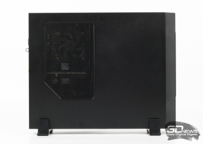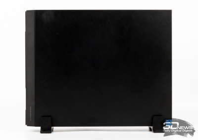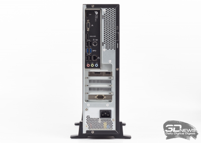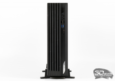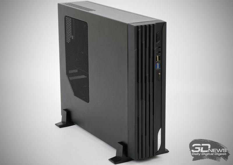 Os PCs de mesa da série PRO DP130 usam o chassi Slim Desktop. Antes de você é uma unidade de sistema bastante compacta com um volume de apenas 13 litros. Como já mencionado, o kit vem com pés para instalação vertical do gabinete. No entanto, ninguém se preocupa em colocar o PRO DP130 na horizontal, colocando o computador, por exemplo, em uma prateleira embaixo da TV na sala. Olhando para a área de trabalho, lembrei-me imediatamente do gabinete Fractal Design Node 202, que suporta placas-mãe de fator de forma mini-ITX e fontes de alimentação SFF.