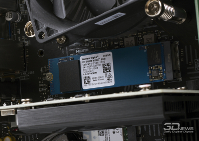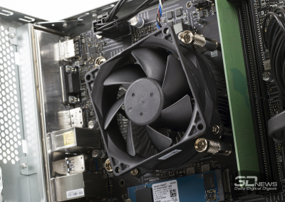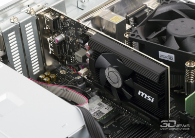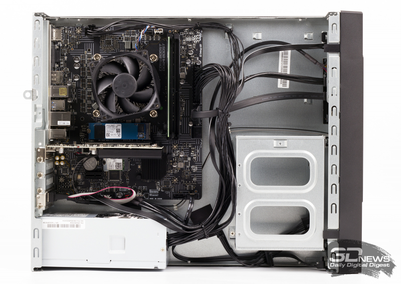 Como você pode ver, o sistema possui 8 GB de RAM instalados na forma de um único módulo DDR4-3200. Por um lado, os “cérebros” do PRO DP130 operam no modo de canal único. Por outro lado, com o tempo, é muito mais fácil atualizar a montagem: precisamos apenas de uma barra com as mesmas características. E o gabinete está equipado com uma cesta para unidades de 3,5 polegadas. Com o tempo, dois discos rígidos podem ser instalados aqui. Finalmente, a placa-mãe tem um slot de expansão PCI Express x1 vazio – mas lembre-se de que apenas dispositivos discretos de baixo perfil podem ser instalados no gabinete.