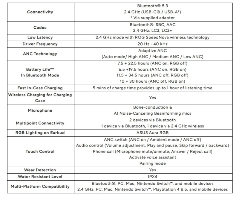 O ROG Cetra True Wireless SpeedNova possui proteção IPX4 contra poeira e respingos de água. No modo Bluetooth, o novo produto pode ser usado com dispositivos PC, Mac, iOS, Android e Nintendo Switch. O transmissor SpeedNova pode funcionar com PC, Mac, Android, Nintendo Switch e consoles PlayStation 4 e PlayStation 5.