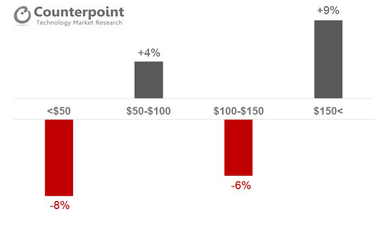 Muitas empresas que anteriormente se concentravam no segmento de orçamento começaram a lançar mais dispositivos de médio porte com recursos adicionais, como cancelamento de ruído ativo. Como resultado, as vendas de modelos abaixo de US$ 50 caíram 8%, enquanto os produtos com preços entre US$ 50 e US$ 100 apresentaram um aumento de 4%.
