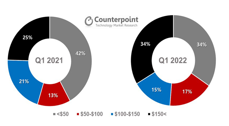 A popularidade das soluções premium de US$ 100 a US$ 150 diminuiu 6% em comparação com o primeiro trimestre de 2021. Produtos ultra-premium, cujos analistas incluem modelos que custam mais de US$ 150, pelo contrário, adicionaram 9% nas vendas.