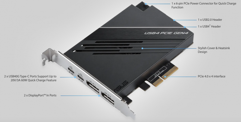 A ASUS lançou uma placa de expansão para o slot PCIe 4.0, que irá adicionar duas portas USB4 Type-C e mais duas DisplayPorts ao computador. O novo produto é chamado de placa USB4 PCIe Gen4.