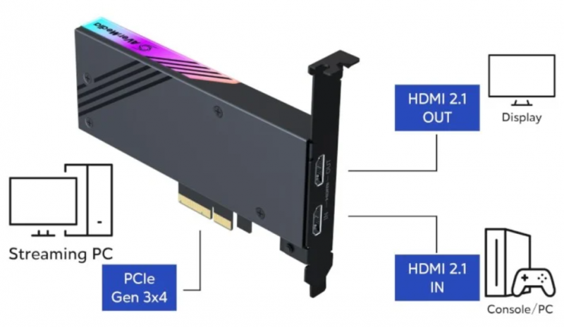 Por sua vez, o modelo Live Gamer 4K 2.1 é uma placa de captura de vídeo mais avançada. Ele pode gravar em resolução 4K a até 60fps e também suporta streaming de passagem de 4K a uma taxa de atualização de 144Hz. Ele também afirma oferecer suporte a VRR e HDR. A novidade vem equipada com caixa plástica com iluminação RGB. Para conectar a um PC, a interface PCIe 3.0 x4 é usada aqui. A placa está equipada com um par de portas HDMI 2.1.