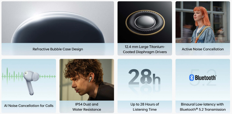 Os fones de ouvido estão equipados com drivers de 12,4 mm. É uma questão de suporte de codecs AAC/SBC. O controlador Bluetooth 5.2 é responsável pela troca de dados sem fio com o smartphone.