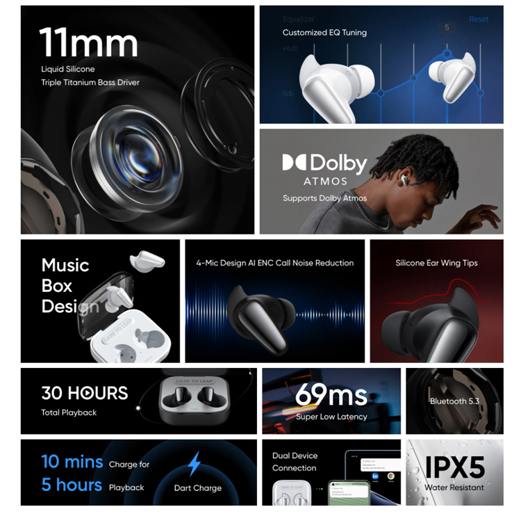 Os módulos intra-auriculares são equipados com drivers de 11 mm que produzem baixas frequências ricas. Por meio do aplicativo móvel complementar, você pode selecionar suas configurações de som preferidas – Bass Boost, Clear Bass, Natural Balance e Clear Vocals. Estamos falando de suporte para Dolby Atmos.