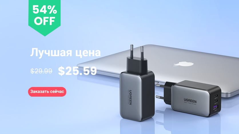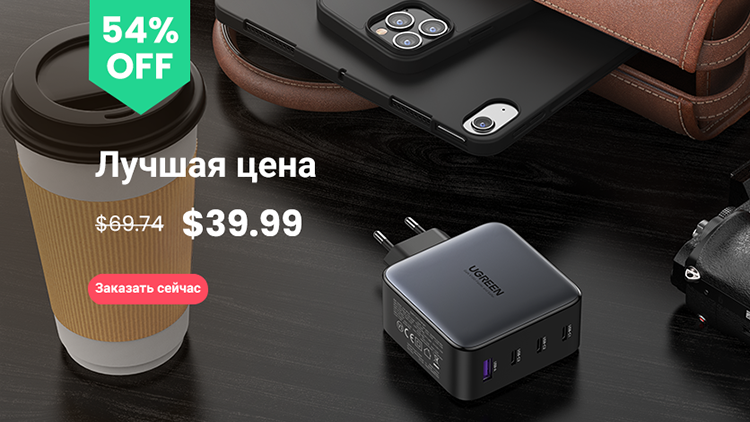 Por exemplo, o carregador Ugreen GaN 100W custará apenas $ 39,99 como parte da venda. Possui quatro conectores ao mesmo tempo: um USB Type-C e USB Type-A, capaz de fornecer até 22,5 W, bem como dois USB Type-C com uma potência máxima de saída de 100 W cada – o suficiente até mesmo para um novo MacBook Pro sob carga.