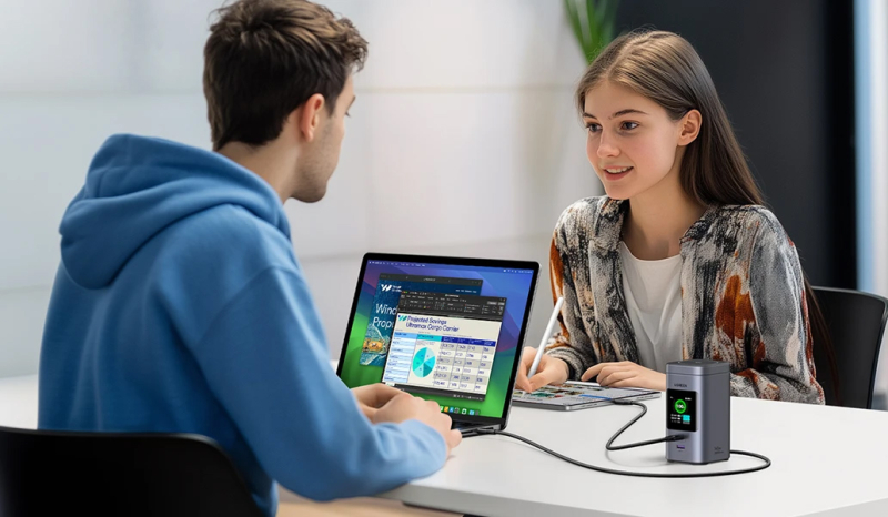 O UGREEN MagFlow Qi2 145 está equipado com duas portas USB Tipo C e uma porta USB Tipo A, suportando 100 W de saída por porta USB Tipo C e carregamento sem fio de 15 W. Ao carregar em duas portas simultaneamente, é fornecida uma potência de saída de 145 W. Ao carregar quatro dispositivos simultaneamente, incluindo o carregamento sem fio, a potência de saída do carregador portátil é de 142,5 W, incluindo a primeira porta USB Tipo C – 60 W, a segunda porta USB Tipo C – 45 W, a porta USB Tipo A – 22,5 W e o carregamento sem fio – 15 W.