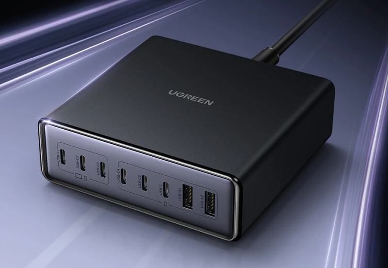 O carregador UGREEN 200W 8 portas GaN 8 em 1 possui oito portas – 6 portas USB Tipo C e 2 portas USB Tipo A – proporcionando carregamento simultâneo para até oito dispositivos diferentes, incluindo laptops, tablets, smartphones, etc. Ele usa transistores GaN, que são menores em tamanho, mais eficientes e podem operar em temperaturas e tensões muito mais altas, com menos tendência a superaquecimento em comparação aos transistores SiC.